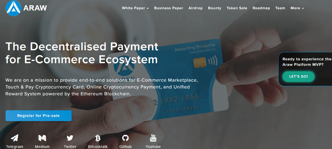 Apa itu ARAW? ARAW adalah platform yang menyediakan solusi end-to-end untuk E-Commerce Marketplace, Touch & Pay Cryptocurrency Card, Pembayaran Cryptocurrency Online, dan Sistem Hadiah Terpadu yang didukung oleh Ethereum Blockchain.